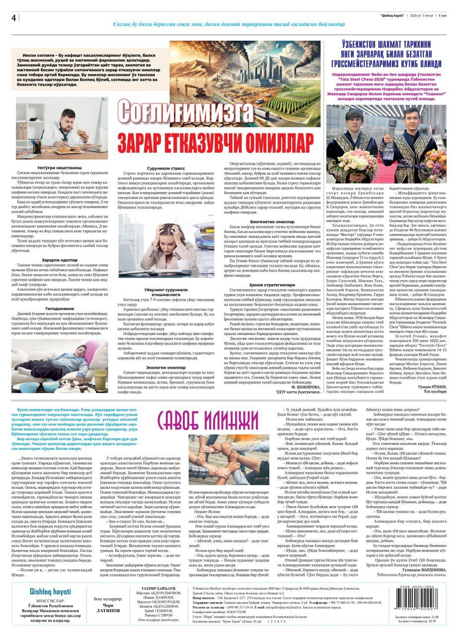 «Qishloq hayoti» gazetasiningnavbatdagi sonida kafedra xodimi F.J.Shokirovaning «Sog’ligimizga zarar yetkazuvchi omillar» nomli maqolasi cgop etildi. Bu maqola hozirgi kunda ancha dolzarb bo’lib, bugungi yomon illatlar va odatlarni o’z ichiga olgan va bu nimalarga olib kelishi, qanday oqibatlar bilan kechishi atroflivha yoritilgan. Noto’g’ri ovqatlanish, zararli odatlar, gipodinamiya, surunkali stress, uyquning surunkali yetishmasligi, ekologik omillar, biogenetik omillar…